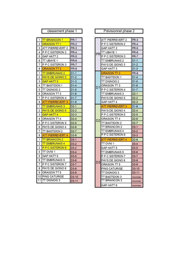 Dans le classement (phase 1), les équipes surlignées en jaune montent dans la division supérieure.